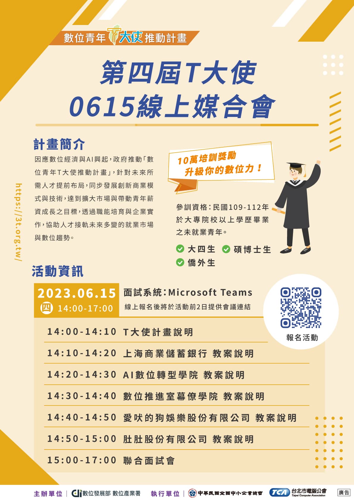 今年第四屆「數位青年T大使計畫」,目前已開始接受報名,歡迎有志提升數位技能、公私立大專院校不分科系畢業3年內之青年參加,詳情可查詢「T大使計畫」官方網站或加入T大使官方Line ID:@3t.org.tw