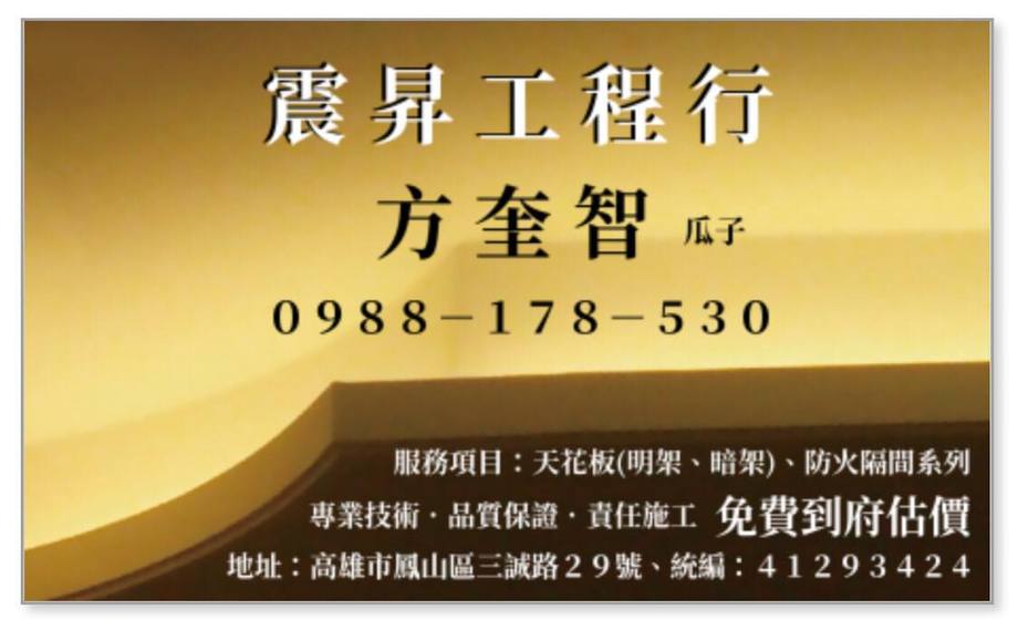 震昇工程行致力於裝潢工程,秉持著以最好的態度做最好的服務、 以最專業的技術做最完整的裝潢、以最符合經濟效益的方法達到您的要求。 此外,我們報價合理並重視客戶的聲音,可依不同的需求與預算,提供多元 且全方位的建議諮詢,贏得許多客戶的肯定與青睞。本公司有信心能夠帶給您 最滿意的裝潢工程與服務。謝謝您,因為有您的支持與指教公司才能更加成長茁壯, 歡迎您的來電洽詢與指教。