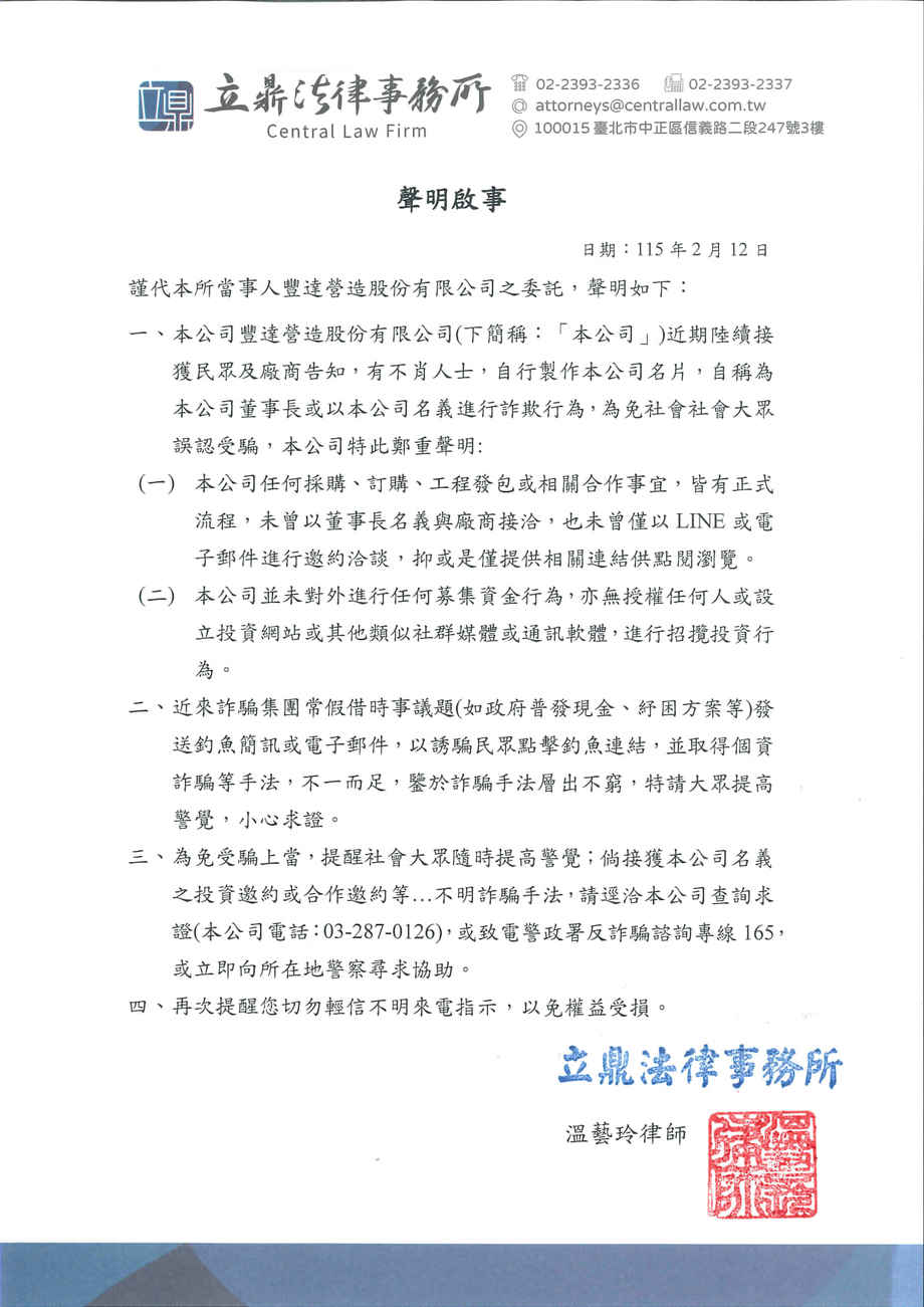 “豐達營造股份有限公司”秉持誠信經營的原則落實企業社會責任,透過良好的公司治理,進一步達成企業的永續發展,創造「三贏:服務顧客、照顧員工、回饋股東」