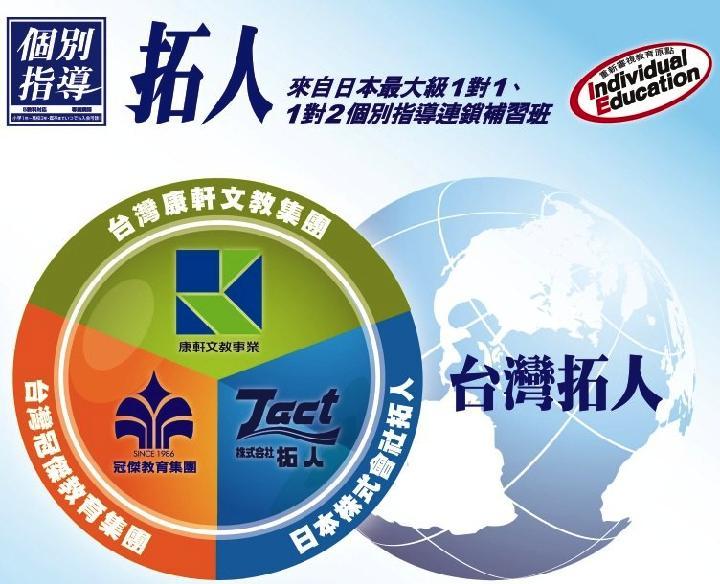 培育出『自己思考、自己決定、自己付諸行動。』的人才是拓人最終的教育目標。 重視每個學生都是獨立的個體,擁有獨立的特質與思考邏輯的特質,以夢想實現為前提,協助孩子們設定許多達成最終目標前的階段性目標,並協助其達成,促使其發掘自身潛能的學習,累積許多的成功經驗,增加自信心,在人生中面對各種考驗時皆能積極地去面對,以實現自我。 我們相信:有100個孩子的話,就會有100種不同的學習方式。拓人的個別指導教學針對各個不同的個性使用最適合的學習方法,使孩子的學力能真正的穩定,養成學習習慣,能自信面對升學、入學考試,在此方面獲得極高的評價,在日本從事個別指導的30年間,已擁有600多間的教室,為眾多的孩子們開拓了通往合格的道路。目前正式引進台灣,成立台灣拓人教育事業股份有限公司。結合了台灣康軒文教集團、冠傑教育集團及日本株式會社拓人三社資源,是台灣學子的一大福音。歡迎您一同加入台灣拓人的行列!