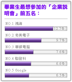 另,校方也會舉辦「企業說明會」,就今年有參加說明會的企業中,受訪者最想參加的前五名依序為u鴻海(12.7%)、v奇美電子(9.7%)、w華碩電腦(7.6%)、x聯發科(6.6%)、yGoogle(6.5%)。