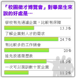 對畢業生來說,「校園徵才博覽會」是重要的求職前哨戰,除了學校有先過濾企業,比較有保障(13.3%)以外,更可以u了解企業對人才的需求(24.7%)、v有比較多的工作機會(20%)、w搶先投遞履歷表(18.9%)、y一次可以面談數十家企業(11.2%)。
