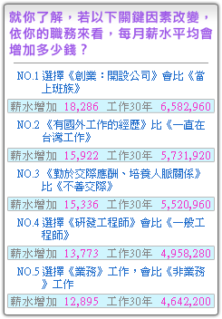 就算是當上班族,命運也是大不同!《有國外工作的經歷》會比《一直在台灣工作》平均薪資高出NT$15,922元,《科技大廠》比《一般行業》高出NT$9,692元;而就職務而言,《研發工程師》比《一般工程師》高出NT$13,773元,《業務工作》又比《非業務工作》高出NT$12,895元。