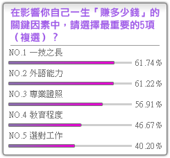 根據【yes123求職網】9月網路調查發現,上班族認為影響「賺多少錢」的關鍵因素中,最重要的是一技之長(61.74%),其餘依序為外語能力(61.22%)、專業證照(56.91%)、教育程度(46.67%)、選對工作(40.20%)。