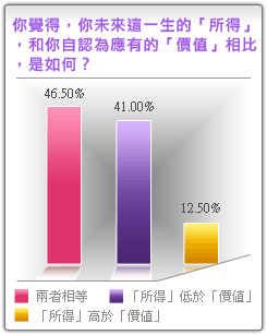 照這個數字看來,應該很多上班族是要嚎啕大哭的,可是有四成六的受訪者認為自己的「所得」和「價值」是相符的,只有41%認為自己的價值遠低於所得。不過,仍有12.5﹪的受訪者認為自己的所得高於價值。