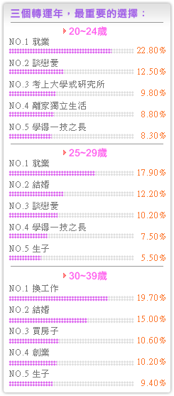 20~24歲,是很多人從學校畢業,決定繼續升學或就業的關卡,也是成年後第一次做自己的主人,決定未來的前途發展。有趣的是,談戀愛的「決定性」竟高於考上大學或研究所。不過,「學習」仍是這個年齡的主調,第三名是求學、第四名是學術一技之長。