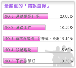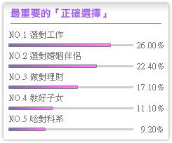 如果你想要讓人生變得更好,應該做對那些選擇?工作、婚姻伴侶、理財排名在前三。但如果你想要走向毀滅,那麼,婚姻伴侶、工作、不良習慣則躍居前三名。這樣的調查結果,真的應了一句老話:「男怕入錯行、女怕嫁錯郎」,現在恐怕男女都怕這兩件事做錯了,結果可能就萬劫不復。