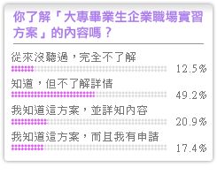其中針對畢業生推動的「大專畢業生至企業實習方案」,有62.7%的人願意申請實習機會,但其實超過一半(61.7%)的畢業生表示根本不了解方案內容。同時,畢業生也認為此方案會讓企業先裁員,再申請此方案錄用新人(35.0%),而由政府負擔實習生薪水,也有圖利企業的嫌疑(37.2%)。