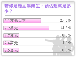 畢業生也降低了對待遇的要求,預估今年平均起薪為2.3萬元,比yes123去年同期的調查數字低了兩千元。而畢業生最想從事的的工作內容依序為:行政總務類(47.8%)、門市客服類(31.3%)、餐飲娛樂類(24.2%),對照企業願意提供的職務為:金融保險類(50.0%)、業務銷售貿易類(47.5%)、財會稅務類(33.5%),落差頗大。