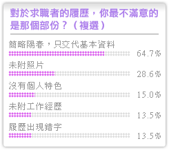 在填寫履歷表時,求職者自評在外語能力、工作經驗、專業證照這三項上表現最弱。對企業來說,求職者履歷只獲得58分,近六成五(64.7%)抱怨履歷太陽春,只交代基本資料,也有近三成(28.6%)不滿意求職者未附照片。就算附了照片,常見手機自拍照、模糊沙龍照或裝可愛,都很讓企業昏倒。