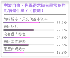 自傳部分,企業只給求職者54分,最抱怨自傳千篇一律,看不出個人特色與優勢(33.1%),其次是落落長,毫無重點(27.1%)、其三是內容簡單陽春(24.8%)。但顯然求職者不這麼看自己的自傳,他們比較擔心的是另外的問題,像不會包裝自己(55.9%)、不想寫得跟其他人一樣(45.6%)。