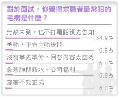 面試部分,企業只給求職者58分,逾半數表示最討厭失約不到,顯示這是求職者的通病,其次是抱怨求職者不會主動提問,其三是未做準備。不同的是,求職者最擔心的是怕自己表達不好、回答不得體(65.2%),而他們最害怕面試官出故意刁難的問題(44.9%),以及實務問題(43.0%)、要求求職者反問(33.9%)。