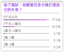 為了突破求職瓶頸,調查發現,求職者平均花了6千元來打理自己的外表,甚至有41.2%的人願意花2萬元整型,最受青睞的整型依序是牙齒矯正、割雙眼皮、隆鼻。另一方面,求職者也希望在語文、證照、人脈等方面繼續努力,希望求職之路能更順暢。