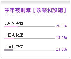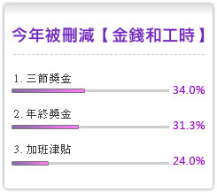景氣不好,連帶影響企業縮減福利。根據調查發現,員工認為企業福利總價值8,920元,但今年被刪減的福利折算金額,則每月損失6,411元,但企業表示若將刪減的福利折算金額,則只有價值4,811元,顯示員工對於福利的衡量超過企業想像。今年被刪減福利細項如右。