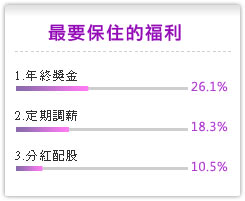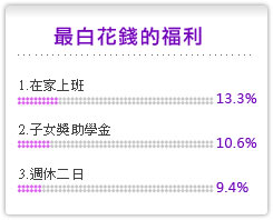 除了知道哪些福利該被刪除或保留外,企業也該知道哪些福利最能激勵人心或是感動員工。在調查中發現績優員工最嚮往的福利為頂級海外旅遊(47.5%)、鑽石首飾(15%)、五星級飯店住宿(8.4%);而員工最羨慕的創意福利則是一日散心假(35.65%)、趣味遊樂室(12.61%)、按摩服務(9.35%)。